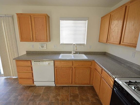The kitchen and breakfast nook include vinyl flooring, laminate countertops, and come fully equipped with all appliances. A guest bathroom with vinyl flooring is located downstairs. Upstairs, the home is fully carpeted and includes three bedrooms, two full bathrooms, and a laundry area with a washer and dryer included in the rent. The second and third bedrooms each feature ceiling fans with lights, vanity areas, and window blinds, and share a Jack and Jill bathroom with a tub and shower combo.