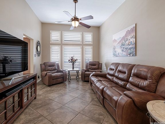 Immaculate One-Story Home with Stunning Outdoor Kitchen in Prime Location. This beautifully upgraded 4-bedroom, 2-bath home has been meticulously cared for and showcases pride of ownership throughout. Every detail has been thoughtfully maintained and enhanced, offering the perfect blend of comfort, style, and functionality. The home features a modern, open layout with tasteful upgrades and quality finishes in every room. The true showstopper is the $75,000 outdoor kitchen and entertainment area-an entertainer's dream-complete with a custom, propane fireplace, Bromic Tungsten Infrared heaters, ceiling fans, and built-in speaker system-perfect for gatherings year-round. Neighborhood amenities include a pool, tennis and basketball courts, BBQ areas, and a park. Inside, enjoy custom tiled floors, wood plantation shutters, and remote-controlled window shades, a JennAir stovetop, and a whole-house reverse osmosis water filtration system installed in 2025. A new roof was also added in 2025, providing peace of mind for years to come. All four mounted TVs convey with the home. Nestled in a desirable, cul-de-sac lot and gated community, this home offers unbeatable convenience just minutes from Northwest Vista College, JBSA Lackland, and the VA Department's San Antonio Northwest Health Care Center. With its exceptional location, single-story design, and impressive updates, this home is a rare find for that discerning buyer who appreciates beautiful design and meticulous care.