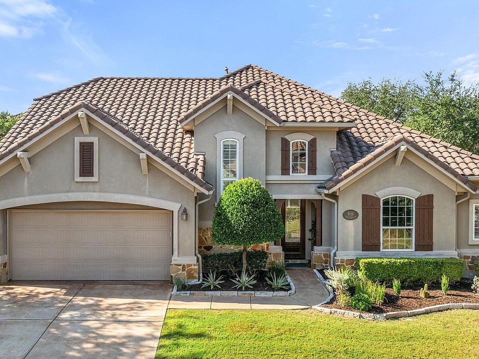 Welcome to 9116 Villa Norte Dr, where Mediterranean elegance meets Hill Country tranquility inside gated Versante Canyon. This Spanish-inspired residence with limestone accents offers 3 bedrooms, 2.5 baths, and 2,611 square feet with 3 versatile living areas on a premium lot backing to protected greenbelt, creating rare privacy and natural beauty. Natural light floods the open living and dining areas, enhanced by elegant West Elm lighting and designer details. The gourmet kitchen impresses with new stainless-steel appliances, including a newer oven, dishwasher, and disposal, designed for everything from quiet mornings to lively dinner parties that linger late. Three distinct living spaces provide ultimate flexibility: a dedicated main-floor office perfect for remote work, open living room with designer fireplace, and upstairs flex room with vaulted ceiling ideal as media room, playroom, or creative studio. This ultimate Versante Canyon home features updated fans, fixtures, and seamless flow between living spaces, including a spa-inspired ensuite that invites true relaxation. Two additional bedrooms and full bath upstairs complete the thoughtfully designed floor plan. Outdoors, the covered patio with custom wood-plank ceiling and ambient WiFi lighting frames your private greenbelt sanctuary. Professionally installed Synlawn turf provides year-round greenery, while modern concrete pavers create clean design lines. WiFi garage opener and 2025 HVAC bring smart convenience and peace of mind. Versante Canyon delivers resort-style living with a lagoon pool, fitness center, and an elegant clubhouse complete with a bar, kitchen, and stone fireplace. Private walking trails connect you to nature, and nearby restaurants add everyday luxury. Minutes from Lake Travis and within Leander ISD feeding to Vandegrift High School, this lock-and-leave home balances Hill Country beauty with Austin convenience.