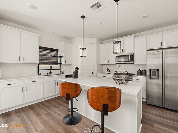 Step into this stunning two-story residence, a spacious haven boasting five bedrooms and three and a half baths within approximately 2,554 square feet of elegant living space and soaring 9-foot ceilings. Upon entry, discover a welcoming guest suite with a full bathroom, providing comfort and privacy for visitors. The heart of the home is an expansive, open-concept living area that seamlessly connects to a chef’s dream kitchen, where shaker-style cabinetry beautifully complements sleek quartz countertops and stylish backsplash. Enjoy the convenience of a walk-in pantry, a centerpiece island adorned with pendant lighting and snack bar, and state-of-the-art stainless-steel appliances—range, microwave, and dishwasher—perfect for culinary adventures. The formal dining space sits gracefully beside the kitchen, ideal for hosting memorable gatherings. Upstairs, retreat to the luxurious main suite with a spa-inspired bathroom featuring dual vanity sinks and a generous walk-in closet, accompanied by three additional bedrooms and a spacious indoor laundry room for ultimate ease. This home masterfully blends comfort, sophistication, and functionality for modern living at its finest.