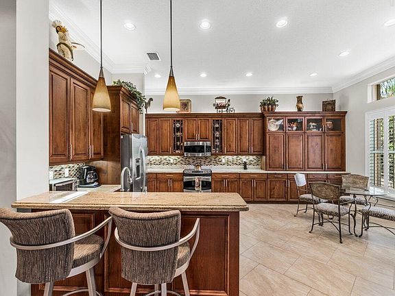 Custom Julia model with 3 bedrooms + den, 3.5 baths and a bonus room situated on a gorgeous lake. Upgrade highlights include brick-laid tile throughout (no carpet), beautiful kitchen and bath upgrades, crown molding, extended screen enclosed patio, gutters, accordion storm shutters, 2021 Carrier A/C, and more. Valencia Reserve is a highly sought-after active adult community with tons of amenities including a Cafe. HOA Fee includes exterior painting of house, lawn care, alarm monitoring, cable and internet and so much more.