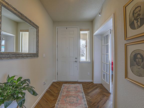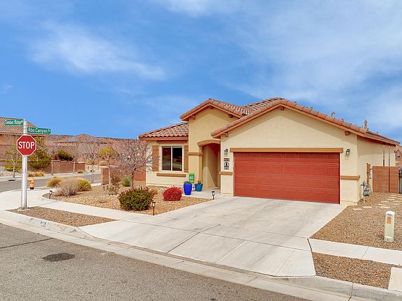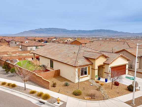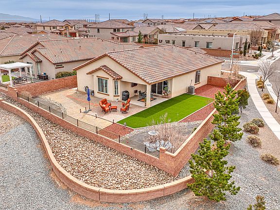 Welcome to this extraordinary Pulte home in Mirehaven! Bright and open single story floor plan with 3 bedrooms + an office, luxury vinyl plank floors throughout the home, surround sound, plenty of storage and refrigerated a/c. The primary bedroom is separate from the other two rooms and has a fabulous new updated closet system. Large full sliding doors lead to your backyard oasis with grass turf, fire pit, and an oversized patio complete with a TV. Perfectly situated on a large corner lot backing up to paths and trails with views of the Sandia Mountains, City lights and floating hot air balloons. Easy access to I40 and close to parks, paths, trails and dog parks. Must see this home today!!!