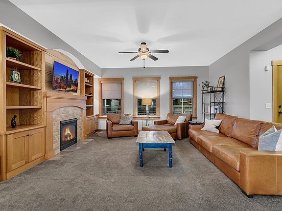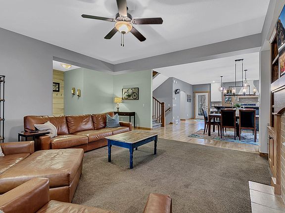 This beautifully updated home in Celebration of Sartell offers exceptional features and updates throughout, starting with a stunning kitchen that includes white painted cabinetry with a large gray painted center island, granite countertops, tile backsplash, oversized cooktop, and a massive double refrigerator/freezer. The main level features real hardwood floors, 9-foot ceilings, a cozy living room with gas fireplace and shiplap accents, a main floor laundry, and a convenient pocket office. Upstairs are four spacious bedrooms with updated carpet, including a primary suite with vaulted ceiling, accent wall, and a private bath featuring dual vanities, jetted tub, and tile shower. A large bonus room is located between the main and upper levels, and the finished lower level includes a fifth bedroom, an expansive family room, and a dedicated theater room. Additional highlights include a heated, oversized three-stall garage, geothermal heating and cooling with in-floor heat! Outside is a welcoming front porch, a screened rear porch, and a large patio that is perfect for entertaining or relaxing.