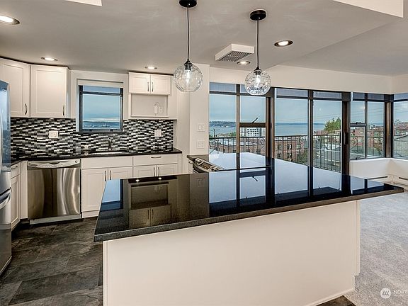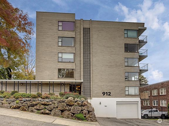 Incredibly expansive views to the south and west! Watch the NY Eve fireworks off the Space Needle, see the sun glowing on Mt. Rainier, ferries on Elliott Bay and the lights of Downtown Seattle! Fantastic corner unit on the SW side of the building on Queen Anne's desirable south slope surrounded by beautiful homes. Super quiet location. Concrete and steel complex. Cute garden area to enjoy nature. Can rent after 1 year. Short distance to all that upper and lower Queen Anne offer. Great walk score to waterfront, Kerry Park, Climate Pledge Arena, restaurants and shopping. BRAND NEW carpet, vanities, paint, lighting and refrigerator. Deeded parking space. Live in the heart of the city within a lovely quiet neighborhood.