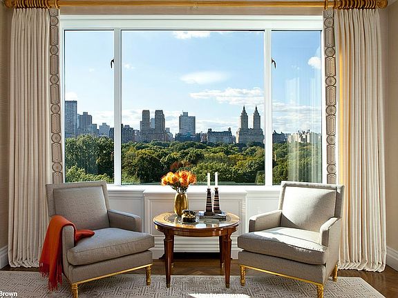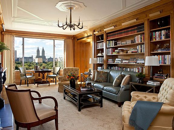 A private elevator landing opens onto an elegant square gallery which leads to a 70 foot enfilade of impressive frontage overlooking Central Park. The entertainment rooms span over 50 feet and include a grand living room, formal dining room and a stunning paneled library. Each of the entertaining rooms has enormous picture windows framing breathtaking views of the Park, as well as west and southern sweeping views of the Manhattan Skyline. Adjacent to the dining room is an amazing 20' x 21' renovated chef's eat-in kitchen with top-of-the-line appliances from Wolf and Miele.The kitchen faces east and enjoys ample morning sunlight, custom cabinetry, and excellent storage space. The oversized breakfast area is perfect for gathering with family and friends, and is ideal for informal entertaining.