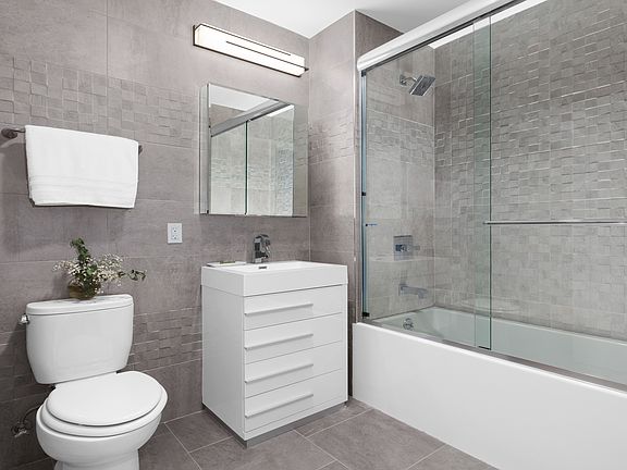 Upon entering the spacious apartment layouts, residents are greeted by expansive windows allowing plenty of natural light to flood the main living areas. The residential interiors boast modern kitchens featuring grey cabinets, quartz countertops, and stainless-steel appliances, as well as bathrooms with contemporary finishes. The Stockton's selection of amenities for residents to enjoy include a furnished lobby with a virtual doorman and package room, a resident lounge and co-working space, communal outdoor terrace equipped with seating and chaise lounges, bicycle storage, and a parking garage.