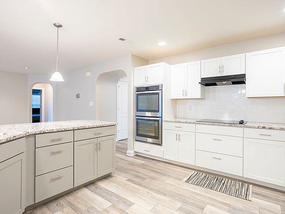 Walk-in primary closetAiry open concept layoutElegant arched doorwaysGranite countertopsSpacious kitchenStainless steel appliancesFully landscaped backyard