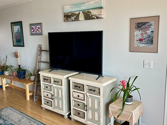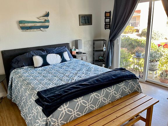 Short term rental for 3 to 4 months, starting in November. Fully furnished 2 BR 1 bath condo, ocean view, one mile to the beach. Corner unit with cross breezes to keep the temperature perfect. One level, no stairs. Remodeled bathroom with walk-in shower and bench seat. Linens, towels, cookware and cleaning supplies provided. Garage not included, easy street parking nearby.
