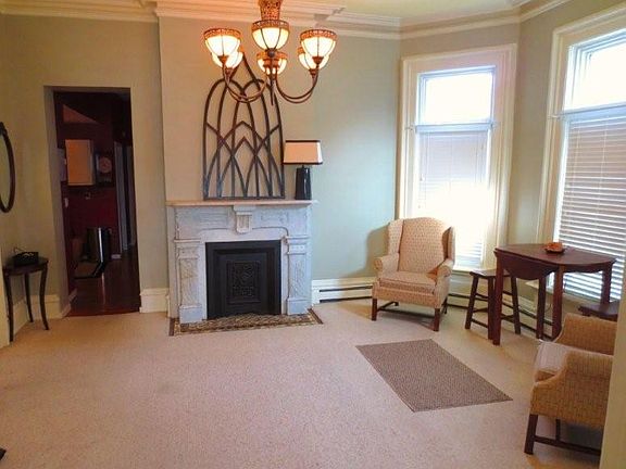 Gorgeous, 1st flr, Victorian condo with tons of RECENT UPDATES & ''OLD WORLD'' CHARM! New weathered grey wide plank vinyl flrs, laminate counters & stainless steel Samsung electric oven/range & LG refrigerator in KIT. New vanity in BA. Tiled shower-over-tub. New 6-panel doors. New carpet. Fresh light grey paint throughout. (2) carved marble ornamental fireplaces (not operational). 10' ceilings w/ elaborate crown moulding & 1' base trim in LR & FR. Grand arched entry door. 1 surface parking space + storage incl. (3) window A/C units. Coin operated W/D in basement. NO DOGS. Up to (2) cats OK. Condo fee incl. heat & utilities. Steps to Brady St., East Pointe Marketplace & Water St. restaurants, shops & conveniences. Prepare to fall in love with this condo instantly!
