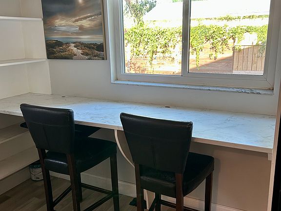 A built-in bar table, perfect breakfast nook or a work-from-home desk for two overlooking the backyard.