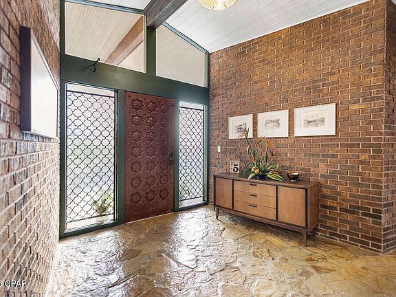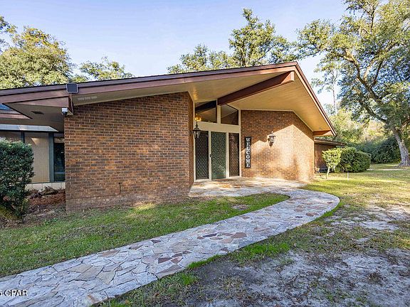 Welcome to the Craven House! This Frank Lloyd Wright-inspired, architect-designed, mid-century modern landmark—is one of Chipley's most recognizable historic residences. Originally built in the 1960s for Dr. James B. and Virginia Craven, this National Register property was designed to evoke a bird in flight, with bold horizontal lines, sculptural geometry, and a seamless connection to nature. Featuring 4 bedrooms, 3.5 baths and bonus room, this residence retains the charm of its original mid-century architecture, beautifully preserved throughout. Interior features include wood ceilings, stone accents, an oversized living room with wood-burning fireplace and original built-ins, dining room with a full wall of windows, and a kitchen retaining its original cabinetry and authentic mid-century layout. All 3 full bathrooms showcase original tile, wallpaper, and built-in vanities, offering an untouched period aesthetic rarely found today. Significant updates include plumbing throughout, electrical panels (3-phase), two HVAC systems (5-ton 2016, 3-ton 2017), water heaters, encapsulated crawl space, and a shingle roof installed in 2018. The exterior boasts an attached 2-car carport, massive, screened back porch, 24′ saltwater pool with decking, and a solar-powered entry gate. Don't miss your rare opportunity to steward an iconic piece of mid-century architecture—livable art preserved with extraordinary care.