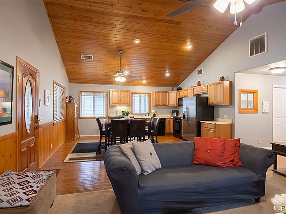 Charming log-style cabin located in the desirable Peter Pan area. Single level cabin with open floor plan for large or small gatherings where all can enjoy the beautiful rock fireplace. T&G ceilings, recessed lighting, carpet in bedrooms, laminate wood flooring, blinds, and seperate laundry room. Kitchen has all you need with stainless steel appliances and an open and bright concept. Master Suite has walk in closet and access to back deck. Second bedroom also has walk in closet and carpet. You can enjoy the mountain air and the starry nights from the front or back deck. Level parking, storage shed, fenced back yard, partially landscaped and easy to maintain. Comes furnished. This is a lovely cabin has been a vacation rental but well maintained. It can be your cabin in the Mountains, make an appointment to see it before it is gone.