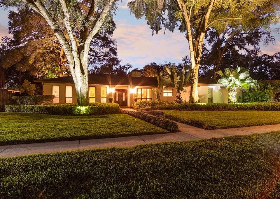 Picture Perfect! Beautiful ranch style POOL home surrounded by mature trees and professional landscaping. The pristine manicured lawn welcomes you with professional lighting throughout. 3 bedrooms plus office/den and can be 4th bedroom, 2 full baths, 2,161 square feet of living space and a spacious side entry 2 car garage. The living room has a cozy warm feel with the hardwood floors, wood burning fireplace, coffered vaulted ceiling, recessed lights and glass pocket doors that lead out to the open patio and pool deck. The kitchen is a cooks dream with large center island with gas cook-top, built-in oven & microwave, custom built-in refrigerator, granite counter tops, recessed & pendant lights and custom shaker cabinets. The formal dining room is large enough for a growing family and has beautiful wood floors and picture window with amazing backyard views. The master bedroom has heavy crown molding, wood floors, walk-in closet, ceiling fan and private ensuite bath that features a granite vanity, custom cabinets, large jetted soaking tub and glass enclosed separate shower. The study/den is perfect for a home office and can also make a great 4th bedroom. The second POOL bath has a large double vanity and tile floors. There's nothing like coming home every day and taking in the Florida sunsets in the sparkling pool and gorgeous private fenced backyard with brick paved deck, outdoor lighting and lush landscaping. Easy access to I-75 and crosstown expressway. Close to schools, shopping and great restaurants.