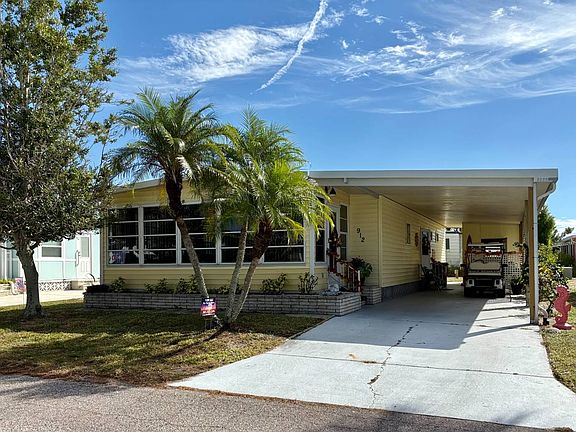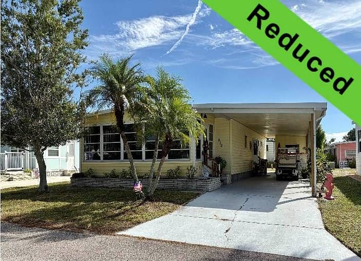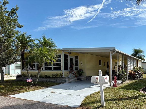 "Timeless Tranquility near the Gulf Coast of Florida" Welcome to 912 Posadas, a beautifully updated and fully furnished home in the sought-after Bay Indies Resort, a vibrant 55+ community in Venice, Florida. This turnkey residence is bathed in a sunshine yellow and offers a relaxed, maintenance-free lifestyle perfect for enjoying Florida's mild winters. The home features a covered carport that extends into a private area with a lattice wall, ideal for barbecuing and unwinding outdoors. Adjacent to this space is a shed equipped with a washer and dryer, shelving, an extra refrigerator, and ample room for storing golf clubs and bikes. A golf cart is also included, adding convenience and charm to your daily outings. Step inside to discover an open-concept floorplan. A kitchen, which is the heart of the home, has newer countertops, a stylish backsplash, and crisp white shaker cabinets. The extended island houses a new stove, a wine cooler, and a microwave tucked on the side. The island offers extra seating for casual meals. While the refrigerator's built-in icemaker is not in service, a portable icemaker sits conveniently on the counter. The kitchen also includes two cabinets that serve as a pantry and coat closet. Throughout the home, you'll find new subfloors and luxury vinyl plank flooring, with some areas tiled for added elegance. Vaulted ceilings and newer double-pane windows enhance the airy, light-filled atmosphere. The 2019 air conditioning unit is serviced annually, ensuring year-round comfort. The dining room accommodates a large table perfect for hosting holiday gatherings, while the living area is furnished with two recliners, a sofa, and a large screen TV. The hallway offers two additional closets, one for linens and one as a broom closet. The guest bathroom has been updated with a new mirror, lighting, a higher vanity, and a tub/shower combination. The guest bedroom includes built-in drawers, two closets, and twin beds or put together to make a king, with plenty of space for additional furnishings. The master suite features a king-sized bed, a comfortable chair, and generous furnishings along with a closet. Behind sliding barn doors, the ensuite bath includes a changing area, a higher vanity, a step-in tiled shower, and a spacious walk-in closet. One of the highlights of this home is the lanai, a carpeted retreat with jalousie windows and screens. It's furnished with a hide-a-bed for guests and a lovely wicker set with a table, making it the perfect spot to enjoy the Florida breeze. This home is ready for you to begin your new chapter in paradise. Don't miss your chance to enjoy winter in this stunning Florida retreat. Come and enjoy life in the Bay Indies 55+ Resort Community in a variety of ways. There are numerous outdoor activities to participate in and keep you active with tennis, pickleball, bocce, shuffleboard, corn hole, a kayak launch and storage. There are three pools, clubhouses, gym, crafts, and unlimited card games, trivia night, dinners, concerts and so much more. We are conveniently located within close proximity to 3 airports and Venice offers restaurants, shopping, fishing, golf, and boating. A casino in Tampa and the Tiger Woods Pop Stroke 2 course putting greens in Sarasota are a must. All listing information given to us is considered appropriate and reliable but should be independently verified through personal inspection by appropriate professionals. Home must be maintained to the Community Prospectus. The lot rent is determined by the Community office and covers all amenities offered including property taxes and lawn maintenance.