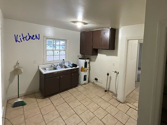 Kitchen with tile floors, sink, and storage cabinets
