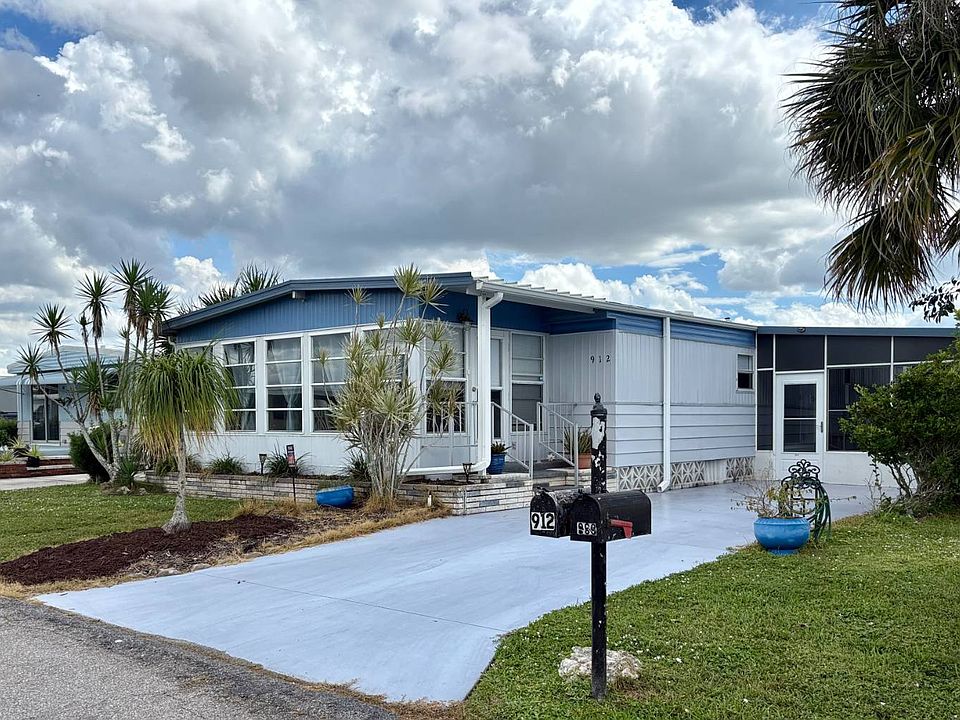 912 Xanadu W, Bay Indies - Escape to Paradise! Welcome to 912 Xanadu W, where you can enjoy paradise year-round or as a seasonal retreat. Ideally located near the Intracoastal Waterway and award-winning beaches, this home offers the perfect Florida lifestyle. Surrounded by charming pony palms, this unique residence features two lanais, providing versatile spaces for relaxation and entertainment. Partially furnished, this spotless home includes a side screen room off the kitchen and carport-an ideal spot for grilling, complete with shades for added comfort. This undercover space offers ample room for storing bikes, while the shed houses the W/D, utility sink, and extra storage for beach gear and tools. With no front carport awning (not required to replace) you can still embrace sunny days and enjoy a number of spots for parking. The front lanai, located off the living room, features jalousie windows, screens, table and chairs, a portable mini A/C unit, beautiful curtains, a ceiling fan, and indoor-outdoor carpeting-perfect for use as a cozy TV room. An exit door conveniently leads to the carport for easy access. Inside, the newly updated and remodeled home boasts a flexible floor plan with the kitchen at its heart. The kitchen offers abundant counter space and cabinetry, a portable center island, newer oven with a glass cooktop, large pantry, tiled backsplash, recessed lighting, and a side counter with benches for quick meals. There's even space off the side of the kitchen to create a small den, office, or coffee bar. The living room includes a sofa and overstuffed chair and entertainment unit, while the dining area features a built-in cabinet, perfect for cocktails or showcasing collections, and a round table for four. The guest bedroom, with its cheerful Key West vibe, comfortably has a queen bed and includes a double closet. The guest bath features a tub/shower combo, a stylish vanity with a shell sink,plus linen closet. The spacious master suite will easily accommodate a king bed and includes double mirrored closets. There are plenty of dressers along with nightstands and still room for extras. An ensuite dressing area with a large vanity and centered sink is the entrance of the bathroom and a tucked-away office space for working from home. The private bath offers a newer step-in tiled shower and also a walk-in closet. Additional features include vinyl plank flooring throughout, a 2023 roof coating, updated vapor barrier, tie downs, and fresh paint in a soft, neutral palette. This pristine 48' x 24' home is designed for comfort, convenience, and Florida living at its finest. Don't miss your chance to own this charming slice of paradise. The 55+ Resort Community of Bay Indies will give you as much or as little to do as you please. Tennis, pickleball, bocce, shuffleboard, kayak launch, 3 mile walking and biking path around the park or just sit and enjoy the wildlife along the 3 ponds. There are two clubhouses with a third being built, numerous clubs, crafts, cards, concerts and dinners to enjoy as there is a full time activity director. If you venture downtown Venice you have restaurants on the water, shopping, boating/fishing on the intercoastal, golf and so much more just 2 miles away. We are located within close proximity to 3 airports, a casino in Tampa and the Tiger Woods Pop Stroke 2 course putting greens in Sarasota are a must. All listing information given is considered appropriate and reliable but should be independently verified through personal inspection by appropriate professionals. Home must be maintained to the Community Prospectus. The lot rent is determined by the Community office and covers all amenities offered including property taxes and lawn maintenance.