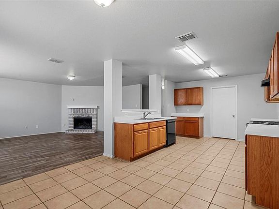 The main level features a large living area with a cozy brick fireplace, flowing seamlessly into the dining space and expansive kitchen. The kitchen offers abundant cabinetry, ample counter space, and a breakfast barperfect for both cooking and entertaining. Neutral finishes, wood-style flooring, and natural light throughout create a bright and welcoming atmosphere.