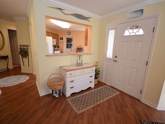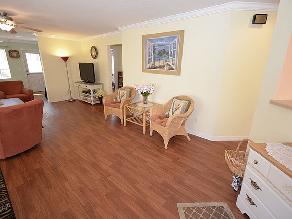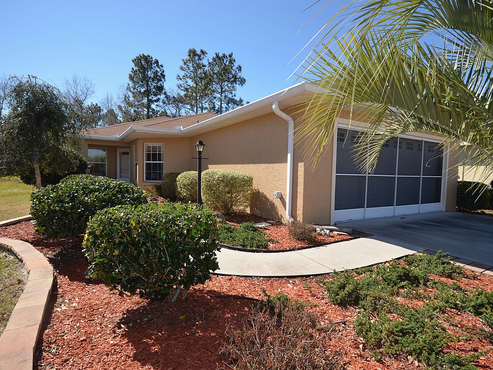 Bedroom plus Den expanded Sheffield model located in the much sought after gated 55+ community of On Top of the World. To your right upon entry is an updated open eat-in Kitchen with Pantry and pass-thru counter overlooking the large combination Living/Dining Room. An additional expanded living area/sunroom is located just behind the Living Room and offers tranquil views. A screened birdcage AND patio on the back of the home offers outdoor living with more views of the wooded area out back. The split bedroom plan features the Master Suite in the back right of the home and boasts crown molding, His & Her closets, and updated Master Bath with step-in shower and double sink vanity. The Den & Guest Bedroom are located in the front right of the home and are joined by a common hallway and Guest Bath. The home features crown molding in main living areas. Den can easily become a 3rd bedroom with walk-in closet.