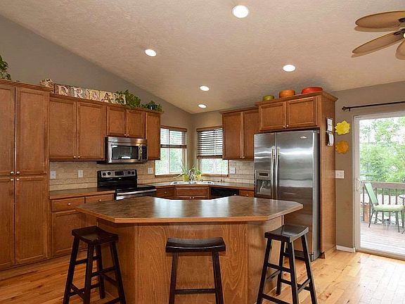 Inc. water feature pond in front and back, paver patio, decking, raised beds, vinyl fencing, beautiful trees for privacy & sunset views. Interior equally as fabulous. great rm concept w/gleaming hardwood flrs, cozy gas frplc, terrific kitchen island, tropical ceiling fans, cathedral ceilings. incredible master ste w/separate shower & tub, dbl sinks & oversized walk-in closet. 2 additional bdrms, full bath, main floor laundry. 4th bedrm, fam rm & lovely bath complete lower. oversized 3 CAR garage.