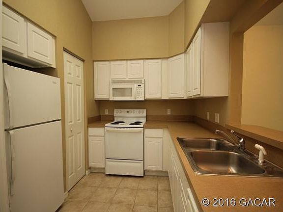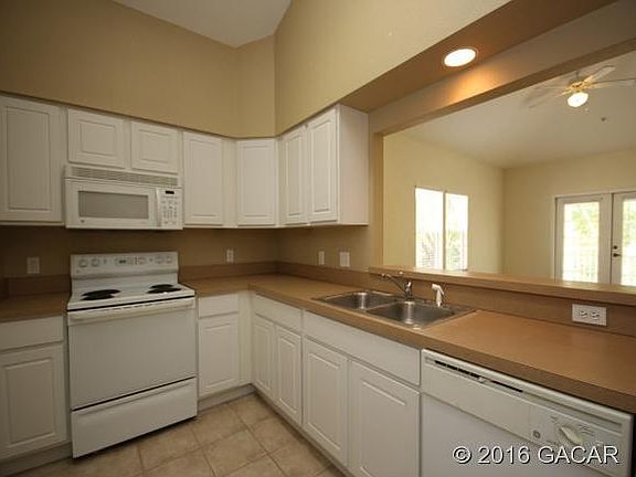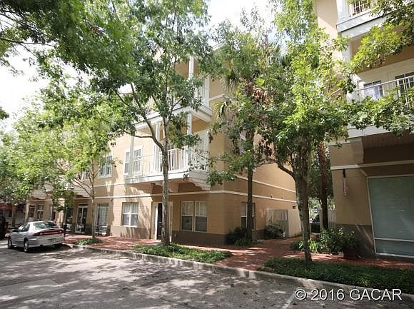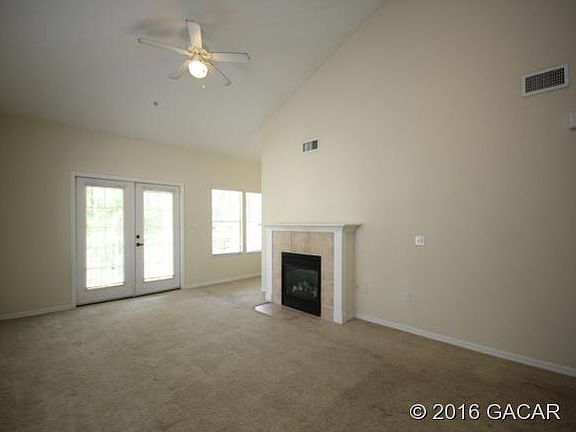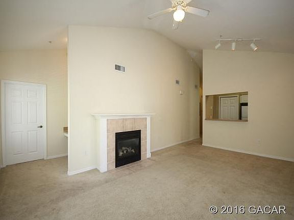 Beautiful 2 bedroom condo located in the upscale Haile Village Center! Living room displays vaulted ceilings and a fireplace! French doors open up to a balcony overlooking a lovely view of Haile. Neutral paint colors throughout. Many shoppes, cafes, and walking trails located close by. Steps away from the weekly Farmer's Market. Washer and dryer included. Graduate students welcome. This condo is a must-see!