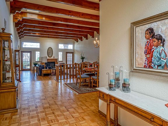 Beautiful Single Story Tanoan West Patio Home in Wimbledon**Open/Flowing Floor Plan**Parquet Floors**Huge Living Area with Fireplace, Wet Bar and Doors Leading to Quaint Covered Patio**Gorgeous High Beamed Ceilings with Leaded Glass Clerestory Windows at the Roof Line**Great Kitchen with Bar and Large Breakfast Nook**Spacious Secondary Bedrooms with Walk In Closets**Luxurious Master with Full Bath and Large Walk In Closet**Big Laundry Room with Cedar Closet**Lots of Storage Including Storage Closet in Garage**Refrigerated Air**Well Maintained Inside and Out**