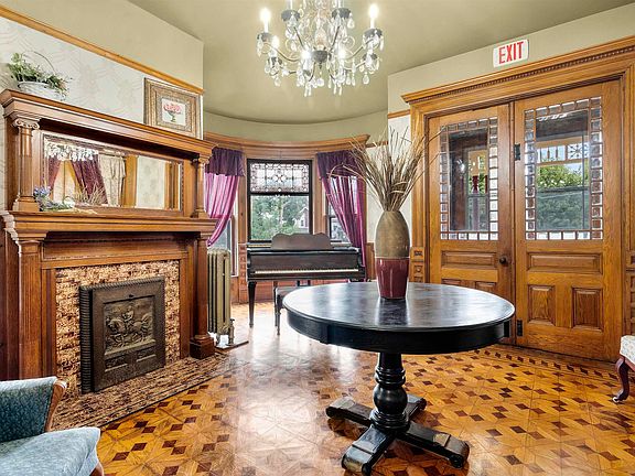 This Queen Anne-style mansion is situated on a large corner lot and the front faces a historic brick road. It was built in 1893 for W.C. Ellis and designed by architect William F. Murphy. Walking through the double doors and vestibule at the front of the home, you'll be greeted by the first of seven fireplaces, a rounded window, and the staircase to the second level. This level of the home offers original woodwork and hardwood floors. To your left, is a set of 10-foot pocket doors leading to the parlor, or family room, which then passes through to a sitting room, or living room, which connects to the formal dining room. In the dining, there is a door leading to the kitchen, as well as a hallway. All of the kitchen appliances stay with the home. You'll also find an office with connected bathroom and a half bath before making your way upstairs. After going up the beautiful staircase, you'll be greeted by a large sitting area. On your left, are two bedrooms each offering private attached 3/4 bathrooms. One of which has a private sitting porch and a fireplace. The primary bedroom offers a fireplace, jacuzzi tub, and 3/4 bathroom. On the second floor there are two more bedrooms. One offering a fireplace and an attached 3/4 bathroom. Down the hallway, there is a full bathroom and the laundry room. The laundry has a second staircase leading back down to the kitchen. This home also has a full walk-up attic. Plenty of room for extra storage, or finish it off for a bonus room. Endless possibilites! Furniture inside the home can be purchased at an additional cost. The basement can be accessed from the kitchen or from the outside, it was used as the owners living quarters when the home was a bed & breakfast. Outside, there is a detached two-stall garage with plenty of extra parking space & an above ground pool. The roof was replaced in 2021 with steel shingles and the exterior of the home has a fresh coat of paint. New Boiler installed 10/2022.