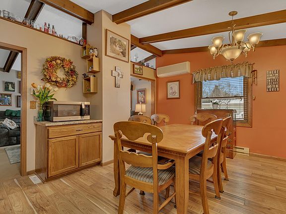 Rambler on .25 Acre corner lot awaits! Kitchen with new LVP flooring, oak cabinets, lazy suzanne, pantry with lots of storage. Vaulted ceiling in kitchen & dining area. Good size living room w/stoned wall and patio door leads to exposed aggerated patio and maintenance free privacy fence. Good size main floor bedroom w/double closet and walk through to full bathroom w/double sink. Main floor laundry room, sink and ceramic tile floors and door. Oak banister, beam vaulted ceiling, over 2200 sq ft finished. Lower level offers huge family room w/wood stove for our cold Mn winters, bedroom w/egress window and sauna. Steel siding, seamless gutters, Roof 2008 with 40 year shingles, Lindsay windows, 2010 Daka wood stove. 2021 cement driveway and garage door 2022, 200 Amp, ductless mini split, apple trees, Nanking cherry & lilica bushes.