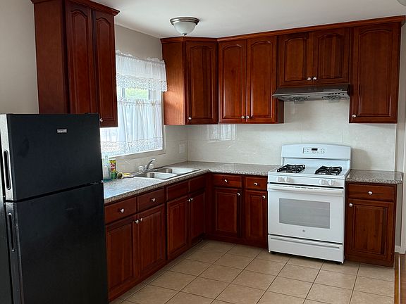 Newly renovated kitchen with upgraded appliances including gas stove/oven, refrigerator, vent hood, garbage disposal and air conditioners.