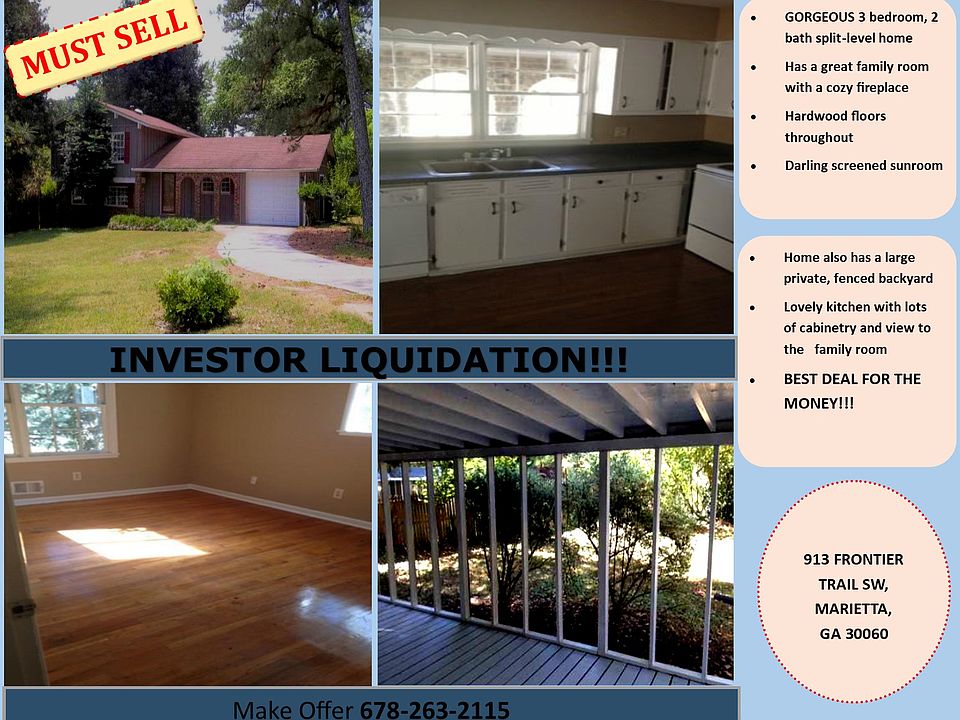 Investor Liquidation must sale!!! Make offer. Sold as is at a discounted price. This GORGEOUS 3 bedroom, 2 bath split-level home has a great family room with a cozy fireplace, hardwood floors throughout, lovely kitchen with lots of cabinetry and view to the family room. Home also has a large private, fenced backyard and darling screened sunroom. Best deal for the money!