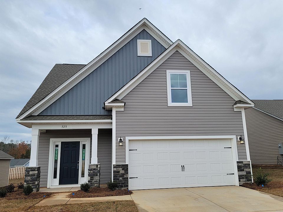WHAT A SWEET DEAL from Great Southern Homes! Get a loan at 5.49% (6.290% APR) on FHA and VA loans! To qualify, one must use Homeowners Mortgage and close by March 31, 2025. On other loan types and later closings, get $15,000 Mad Money for options and/or transaction/loan fees. (Use of Homeowners Mortgage required if used for closing costs.) New contruction by Great Southern Homes in Cottages at Roofs Pond with exterior HARDY PLANK siding! Sabel II B Floorplan with stone and hardiplank exterior! Main Level Owner's Bedroom with 2 BRs, Full Bath and Bonus Room Up! The front porch opens into the foyer with powder room and archways leading into the Greatroom. Luxury Vinyl Flooring throughout entire main floor living spaces. Carpet in Owner's BR. Large kitchen, also with LVP, has ample storage with gray shaker cabinets, 3 CM granite, stainless appliances with smooth top range, upgraded kitchen faucet, large breakfast bar, tiled backsplash, pendant lights, and pantry. The home also has the Advanced Series Trim and updated Lighting package included. Plumbing upgrade also included.The Owner's BR has a large walk-in closet, box ceiling, ceiling fan and private bath with shower, soaking tub and dual vanity. All baths and laundry have luxury vinyl floors. Covered extended rear porch! Double garage. Landscaped with sod and shrubs. Front, sides, and back automatic sprinkler system.One-year builder workmanship warranty and 10-year structural warranty are included! The home is loaded ...