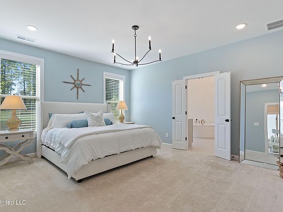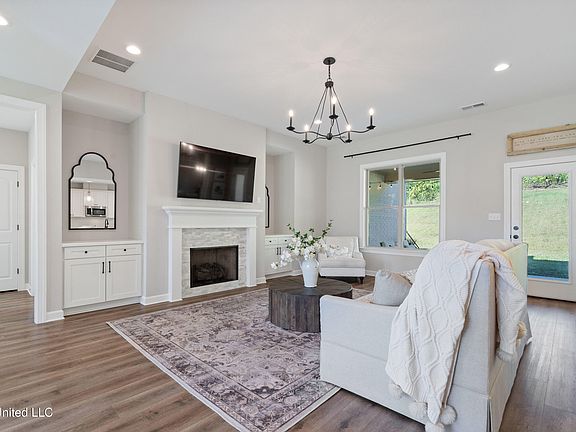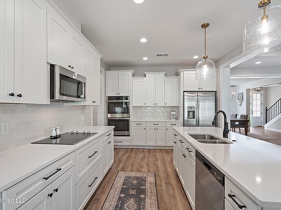 Like-new 5-bedroom, 3-bath custom home combining modern comfort and timeless design in DeSoto County Schools. Open-concept layout connects the living room, dining, and kitchen under high ceilings with abundant natural light. The kitchen features quartz countertops, tile backsplash, white cabinetry, double ovens, a large island, stainless appliances, and a walk-in pantry. The gas fireplace with built-ins creates a welcoming gathering space in the great room. Two bedrooms are on the main level including a spacious primary suite with a freestanding tub, dual vanities, and a walk-through shower lined with floor-to-ceiling tile and dual showerheads. Upstairs includes three additional bedrooms (one large enough to be a bonus room) and a full bath. Luxury vinyl plank floors extend through main areas. A mudroom with built-in lockers connects to a large laundry room for daily organization. The covered patio overlooks a peaceful backyard bordered by trees . . . ideal for relaxing or entertaining. 100% USDA Eligible area. Video tour and floor plan available.