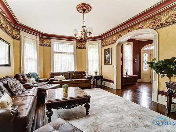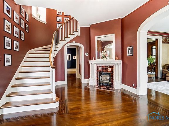 Historic beauty filled with character throughout Main floor boasts a grand foyer, spacious living room, private den with custom shelves and fireplace, quaint sunroom, and bonus room currently used as a bedroom. Charming kitchen with ample cabinetry, butler's pantry, Corian counters, breakfast nook and formal dining. Second floor offers four bedrooms, including an owners' suite with sitting area, and three full baths. Third floor has a fifth bedroom, full bath, living area, and walk-in closets. Backyard features an oversized deck, mature landscaping, detached garage with loft storage and more