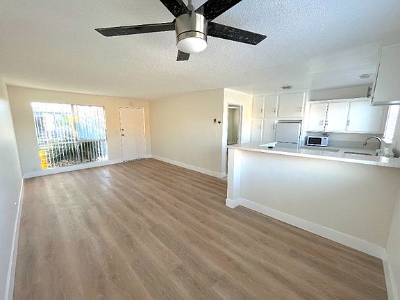This spacious one bedroom apartment with a bright and open floor plan is perfect for entertaining. The kitchen seamlessly flows into the dining area, complete with a breakfast bar, and out into the long living room. The living room has plenty of natural light and space for comfortable seating. The apartment features laminate floors, granite counters, ceiling fans, built-in microwave, and wall-to-wall mirrored closets in the bedroom. The community boasts beautifully manicured landscaping and a secure gated entrance that ensures your privacy and peace of mind. Oceanair apartments offer a serene oasis in this prime beach area. You can enjoy the gorgeous and inviting swimming pool and garden area, with plenty of patio seating and a gas grill. On-site laundry facilities. One covered parking spot available for an additional $45 per month.