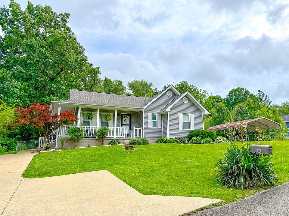 Extremely charming and move-in ready, this 3BR, 2BA home is the perfect starter or downsizer, blending cozy cottage charm with practical ranch-style living. Recently updated with modern gray vinyl siding, crisp white trim, and a 2-year-old roof, this home boasts serious curb appeal. Relax on the inviting wrap-around front porch or entertain on the rear deck with composite flooring — both of which are trimmed in white vinyl railings. All exterior finishes are designed for longetivity and minimal maintenance. Inside, enjoy high-end Pergo flooring throughout and a kitchen with newer stainless steel appliances and front porch access. The dining area opens to the back deck, leading to a concrete patio and a fenced backyard — your own private, secluded retreat perfect for recreation and/or household pets. With two concrete driveways, a covered carport, and ample parking for both owners and guests, this home is as convenient as it is cute. Located inside the city limits, you're minutes from schools, shopping, dining, businesses, and houses of worship. Don't miss this opportunity to own a home that checks all the boxes!