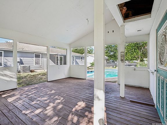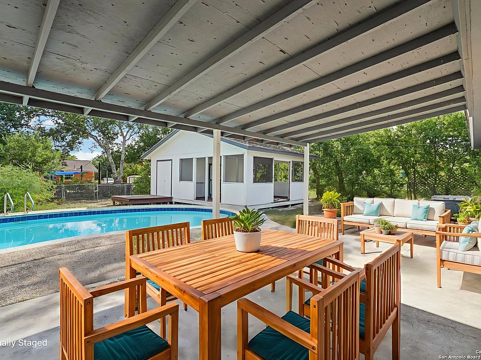 Welcome to 913 Zwicke St, a beautifully updated 3-bedroom, 2-bathroom home nestled in the heart of Seguin that blends modern style with everyday comfort. Freshly remodeled inside and out, this property offers a light and open layout, sleek finishes, and an entertainer's backyard with a private pool. Step inside to find a spacious living area with new flooring, accent walls and beautiful lighting that sets the tone for the home's clean, modern design. The brand-new kitchen features white shaker cabinets, new countertops, subway tile backsplash, and stainless steel appliances - ready for both weeknight dinners and weekend hosting. The primary suite offers a generous layout, updated ensuite bath with a combination shower, and plenty of storage. Additional bedrooms are equally refreshed with new flooring and fixtures. Outside, enjoy summer days by the in-ground pool and shaded back patio. A detached pool house/screened structure adds flexible space for storage, hobbies, or entertaining. The exterior has been given a fresh, modern look with dark painted brick, charming wood shutters, and a welcoming front porch.