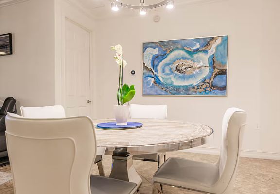 The master suite boasts a luxurious en-suite bathroom with a soaking tub, walk-in shower, and walk-in closet. The second bedroom includes a queen-size bed, while the third features one full bed plus two twin beds, perfect for families or groups.