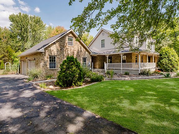 Welcome to this stunning retreat-an exceptional 3-bedroom home with 2 full baths and 2 half baths, perfectly situated on 2.5 acres of serene beauty. Whether you're gathering on the bocce court, relaxing on the wraparound porch, or enjoying the shade of the gazebo, the sprawling lawns framed by towering trees make you feel worlds away, yet you're only minutes from downtown. The rugged stone facade extends to a spacious two-car garage, offering ample storage and convenience. A full staircase leads to an upper level with incredible potential-ready to be finished into a studio, office, or guest retreat. Step inside and you'll be captivated by the soaring vaulted ceiling and floor-to-ceiling windows that bathe the living space in natural light. The main-level bedroom is a true retreat, boasting a spa-inspired bath that feels like a private oasis. Downstairs, the expansive finished basement offers endless possibilities with a massive rec room and a dedicated workshop. Outdoors, summer dreams come alive with a sparkling in-ground pool, while a versatile pole barn with 12-foot garage doors is perfect for hobbyists or storage. Recent upgrades add peace of mind, including a new roof (2021) and new HVAC (2024). This home is more than just a place to live-it's a lifestyle.