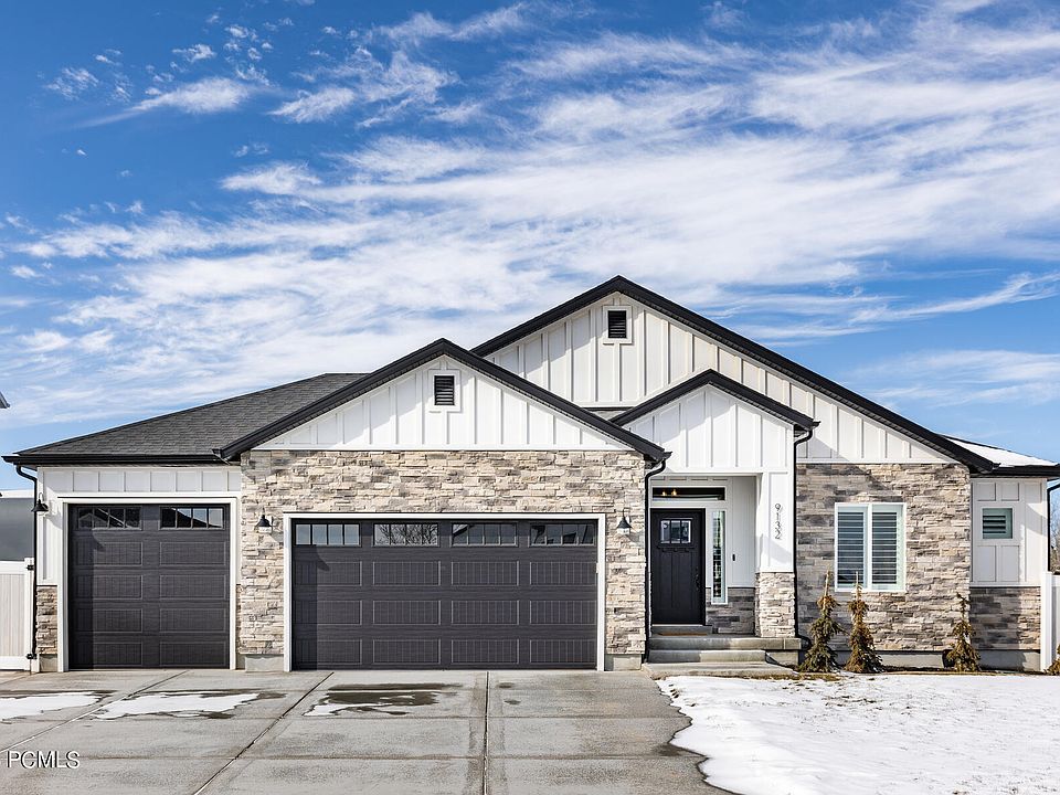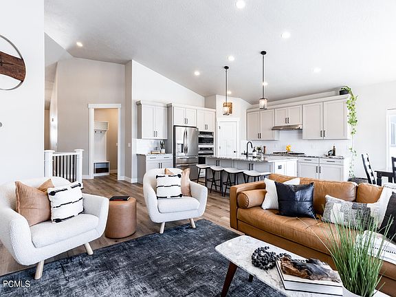 A beautiful, modern designed Rambler is now available in a highly sought-after neighborhood in West Jordan! Centrally located to the freeway, main corridors, restaurants, shopping, schools and parks, this home offers a defined style inside and out, and mountain views in every direction! The garage comes ready with epoxy coating flooring, painted walls, extra-length in 3rd car garage and extra-long RV pad, ideal for families that own adventurous toys! Also offering features such as, an open concept floor plan with vaulted ceilings, great-room and cozy fireplace! The kitchen gives a spacious and inviting feel with an over-sized island, chef-type stainless-steel appliances and extra cabinetry with walk-in pantry. From commercial grade LVP flooring throughout, to sleek contemporary lighting, and electric blinds throughout, this home won't last! The owner's suite offers a lot of natural light, a spa-like bathroom with double sinks, separate tub/shower and a walk-in closet.