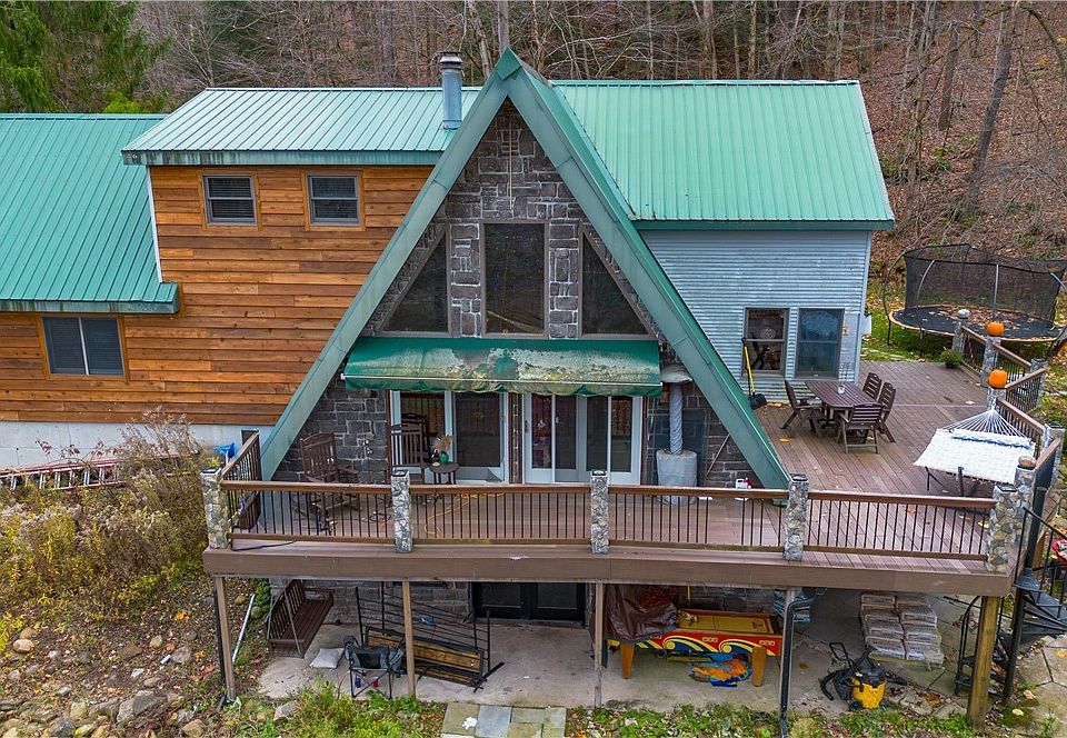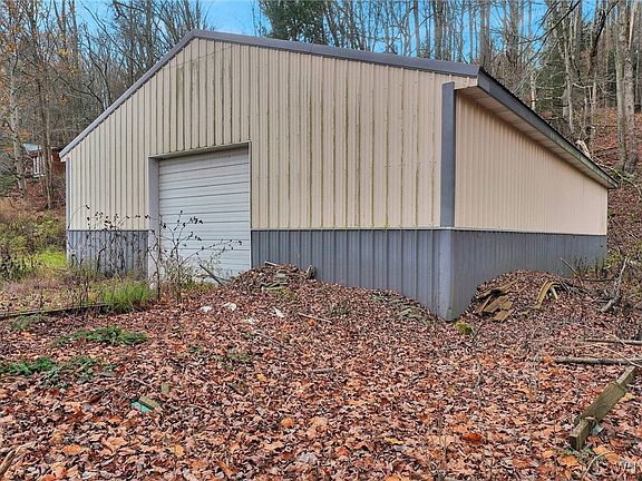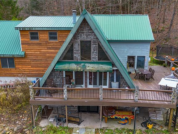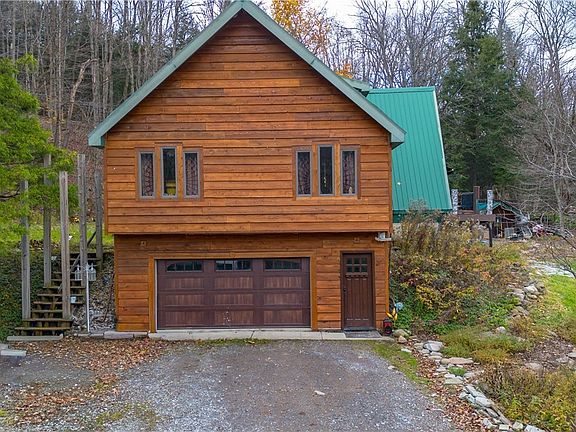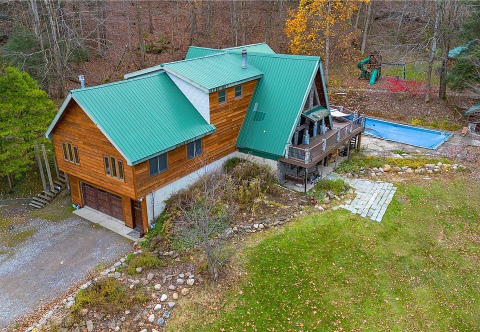 Discover your dream retreat with this stunning chalet style home nestled on over 68 wooded acres with large outbuilding and cottage just moments from kissing bridge! You'll enter the property via your own bridge that crosses the creek. This exceptional property features three spacious bedrooms and 2.5 baths, showcasing hickory floors throughout for a warm and inviting atmosphere. Step inside to an open concept living area ideal for entertaining. Kitchen is well appointed with granite counters and all Wolf appliances that the culinary adventurist! Downstairs you'll find a rec room complete with pool table, stone fireplace and theater! From the walk out basement you can enjoy the outdoors of this retreat that provide more space for entertaining, including an outdoor kitchen, Olympic size in-ground pool w pool house and an area set up for an outdoor theater! Adding to the allure is a charming two-bedroom guest cottage, ideal for visitors or potential rental income. Experience the perfect blend of comfort, entertainment and tranquility!