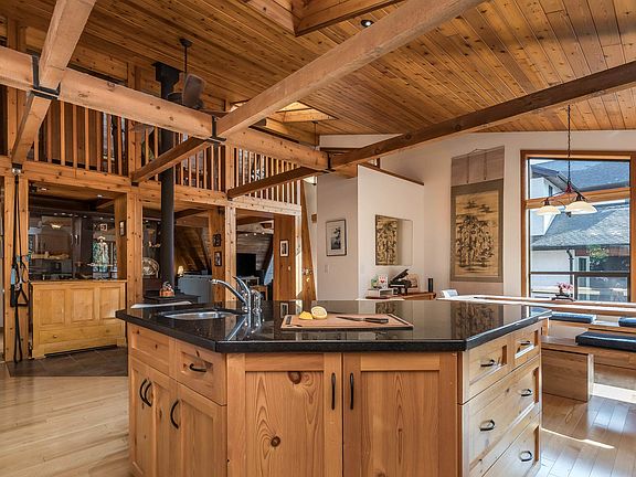 Timber-frame homeSoaring vaulted wood ceilingsExposed beamsExpansive floor-to-ceiling windowsOpen concept layoutFree-standing wood stoveSmart switches