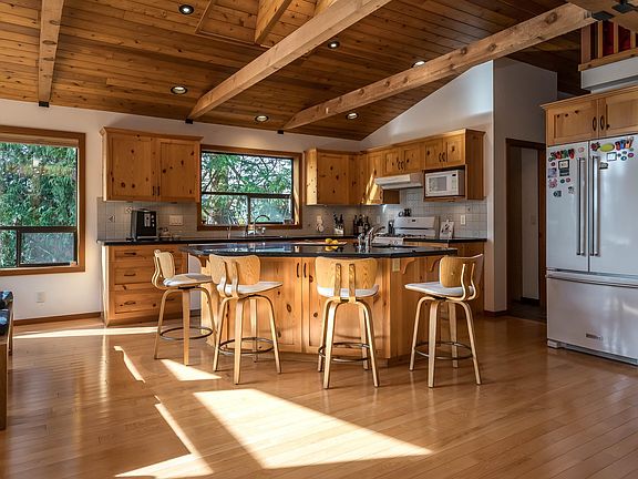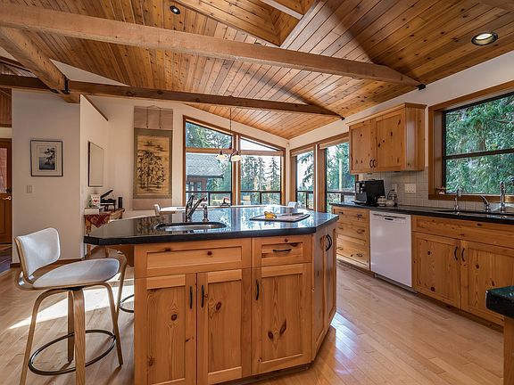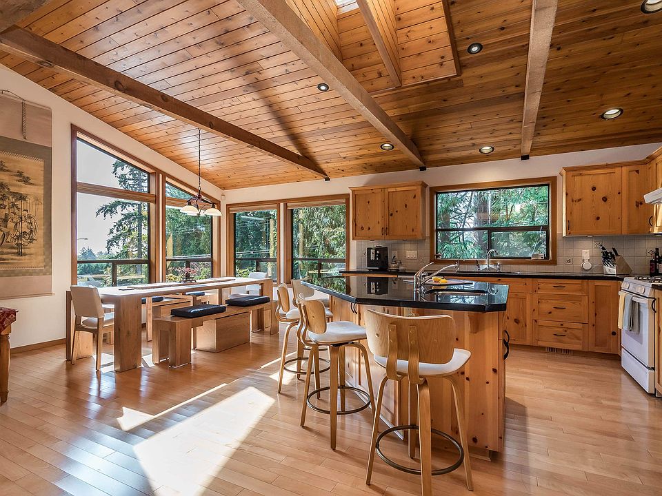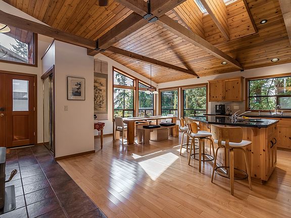 Experience West Coast living at its finest in this breathtaking timber-frame home. Soaring vaulted wood ceilings, exposed beams, and expansive floor-to-ceiling windows create a stunning, airy ambiance flooded with natural light. The open concept layout showcases a spacious kitchen with knotty pine cabinetry and a cozy living area anchored by a classic brick fireplace and free-standing wood stove. Offering 3 bedrooms plus office, 3 baths, and a private 1-bedroom in-law suite with separate laundry. Enjoy seamless indoor–outdoor living on the large deck overlooking a fully fenced, tree-lined yard. Smart switches, oversized double garage with workshop, and striking architectural details throughout—this home is truly one-of-a-kind. Book your private viewing today!