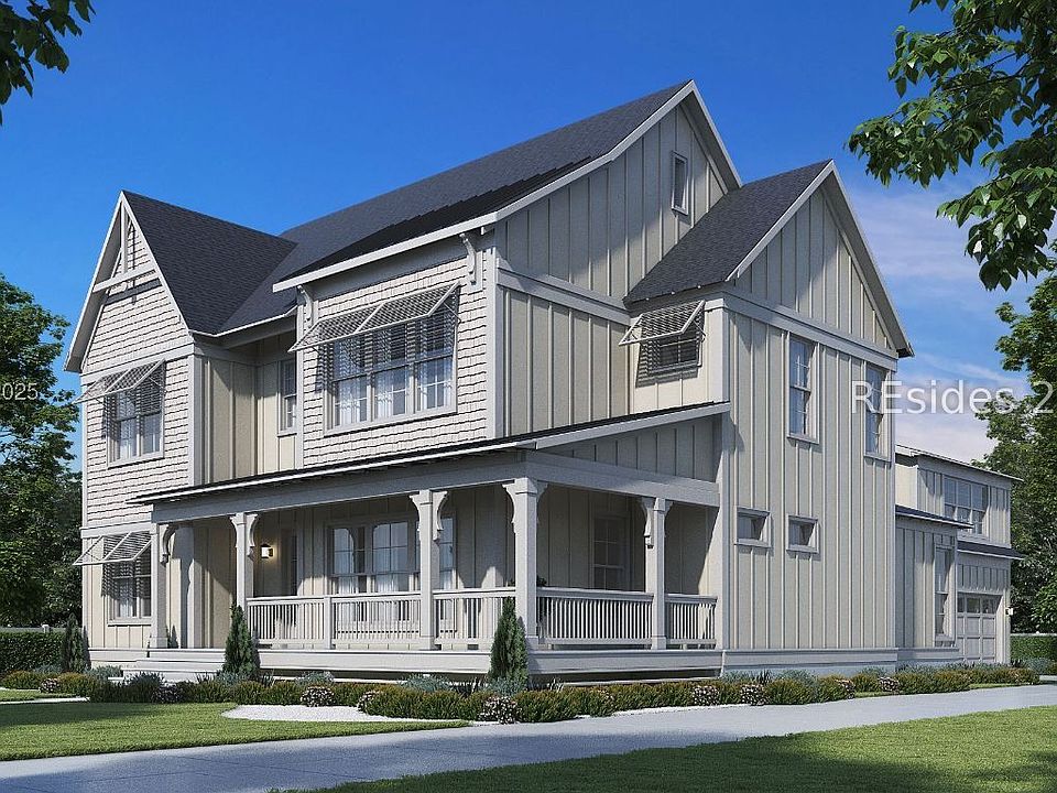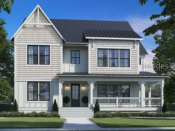 Steps from The Sands Beach and the heart of historic Port Royal, this newly built coastal home offers 3,733 sq ft with an additional 511 sq ft above the detached garage that may be finished for future guest space or studio (buyer to verify). Estimated completion 12-18 months, with potential to select certain finishes depending on construction phase. Built on an elevated tabby foundation with oyster-shell accents, the home features Hardie board-and-batten siding, natural wood details, and a welcoming front porch. Inside, soaring ceilings, wide-plank white oak floors, and an open layout connect the living area to a designer kitchen with custom cabinetry and high-end fixtures. Located in a walkable waterfront community near The Sands, marina access, dining, shops, and boardwalk.