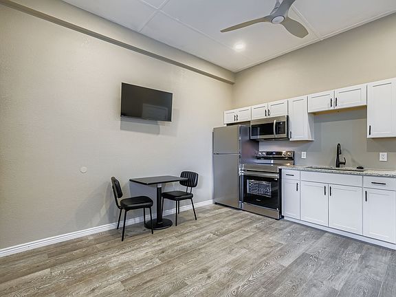 High end tile throughout and stainless steel appliances add to the luster of this well crafted studio.