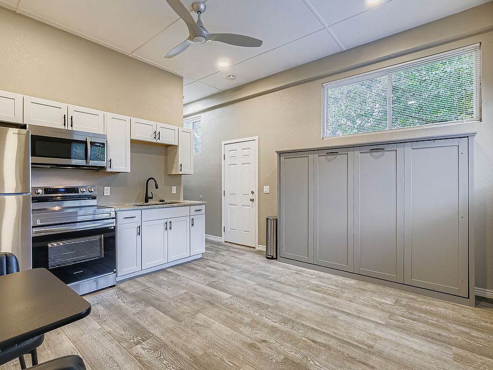 Includes washer & dryer, queen size Murphy bed, dining room table and chairs, TV, and arm chair! Thoughtfully crafted storage spaces built into the laundry area and bathroom.
