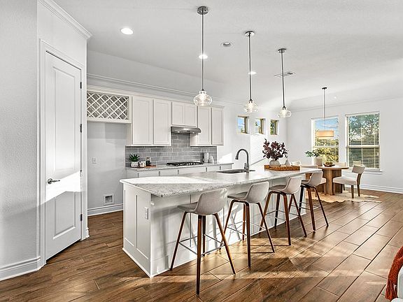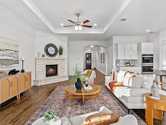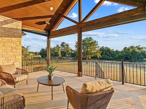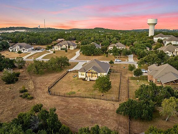 Built in 2019 by Century Communities, this meticulously maintained single-story home offers 2,708 sq ft on nearly one acre of beautiful land in Butler Ranch Estates in Dripping Springs. The open concept layout includes three bedrooms, a dedicated office with French doors, and a flex/media room that can easily be turned into a fourth bedroom, plus 2.5 baths and a three-car side-entry garage built for large vehicles with 8-foot doors and a 3-foot depth extension. Guest bedrooms share a Jack and Jill bath on the opposite side of the home from the primary suite for added privacy. The kitchen features matte quartz countertops with a suede finish, a center island and breakfast bar, stainless steel appliances including a propane range, double oven, and microwave, plus a large walk-in pantry and dining area with updated lighting. Flooring includes faux wood tile and new carpet throughout as well as the home has recently been painted a bright white, making it move in ready. The living area includes a propane fireplace, high ceilings, arched doorways with art nooks, and pre-wiring for surround sound. The primary suite offers a bay window overlooking the backyard, double vanity, soaking tub, separate shower, and walk-in closet. The garage includes an EV charger, whole-home surge protector, wired for a generator, extended attic decking, landscape lighting stubs, and multiple network drops. The covered back porch, with decorative wood trusses, features remote-controlled shades for year round enjoyment and overlooks a level yard with room for a pool. The property backs to a large oak and wet-weather creek behind the fenceline for privacy. The fenced area can be expanded to the lot line, which is much farther than the current fence perimeter. Located minutes from downtown Dripping Springs and zoned for Dripping Springs ISD, this property combines hill country living with proximity to modern day amenities like HEB, shopping and schools.