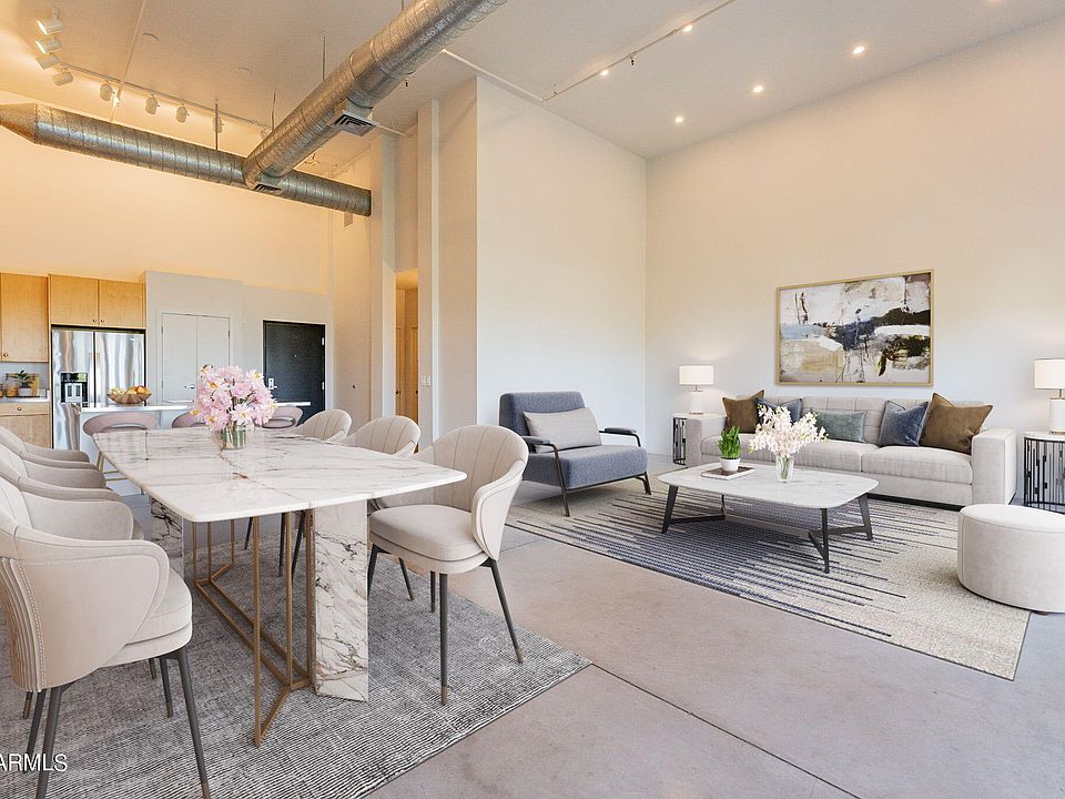 Experience urban luxury in this stunning mid-town penthouse loft with breathtaking views, located adjacent to the Phoenix Country Club. This upscale condo boasts contemporary finishes, soaring 15.6' ceilings, exposed ductwork, and sleek polished concrete floors. The open floor plan offers northern exposure, leading to incredible panoramic views of Camelback Mountain, Piestewa Peak, and the dazzling city lights, all of which can be savored from the comfort of your living space or private balcony. Residents also enjoy top-notch amenities, including a community pool, rooftop deck with BBQ area, and a state-of-the-art fitness center. Conveniently located close to downtown and mid-town, you'll have easy access to Phoenix's best dining, entertainment, and cultural venues.