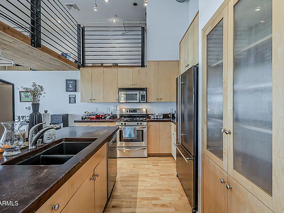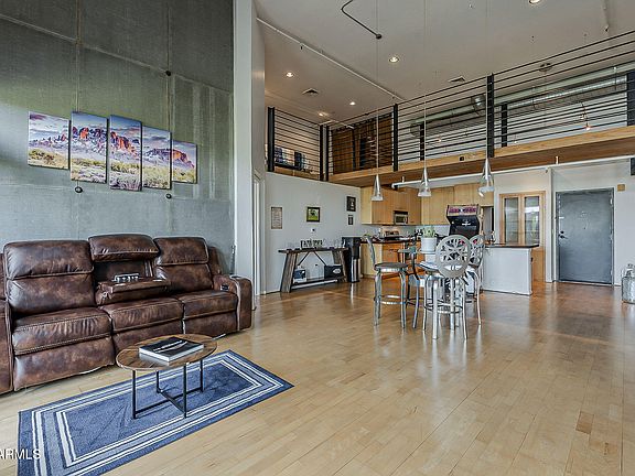 Experience city living with a one-of-a-kind perspective in this Artisan Lofts condo located in the heart of Downtown. The highlight? A private rooftop deck complete with a fireplace, built-in grill, and gorgeous mountain views perfect for quiet evenings or unforgettable gatherings under the Arizona sky. Inside, soaring ceilings and an open layout create a bright, airy feel. The kitchen blends style and function with stained concrete countertops and maple cabinetry, while the striking spiral staircase adds a modern, architectural touch. This gated community offers even more to enjoy, including a heated pool for year-round relaxation and the convenience of two dedicated garage parking spaces. With its blend of thoughtful design, unique features, and unbeatable views, this condo delivers!