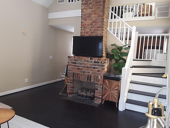 Separate entranceRocking chair front porchSmall fenced yardDark bamboo floorsGas logsCeramic tile bathroomsExposed brick fireplace