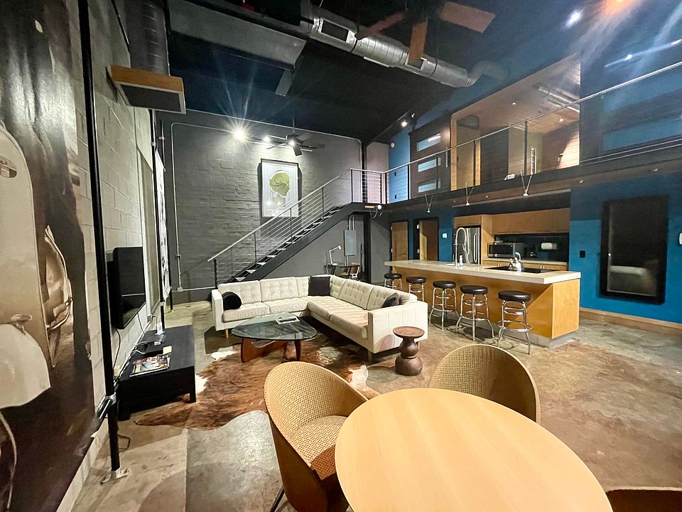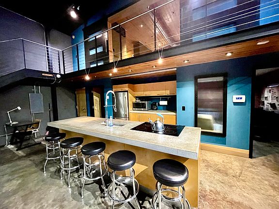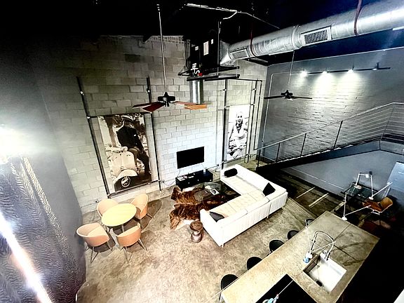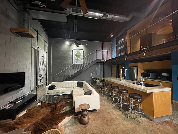 This loft is approximately 2000 square feet and consists of 2 bedrooms and 2 full bathrooms. It boasts exposed brick, steel truss beams and stained concrete floors and countertops. All cabinetry is custom- built and the modern kitchen contains the quietness, efficiency and integrated design of stainless steel Bosch appliances. The bathrooms consists of Kohler low boy toilets and oversized stainless-steel shower pans, marble walls with three Grohe shower-heads. The ceilings are accented with exposed aluminum spiral ductwork hung with leather strapping along with a combination of both exposed corrugated steel and clear finished tongue & groove boards. The loft also contains loads of high end, hard to find low voltage lighting. The large 2 car garage operated with remote door lifts provides covered parking for SUV's and larger than normal sized trucks.