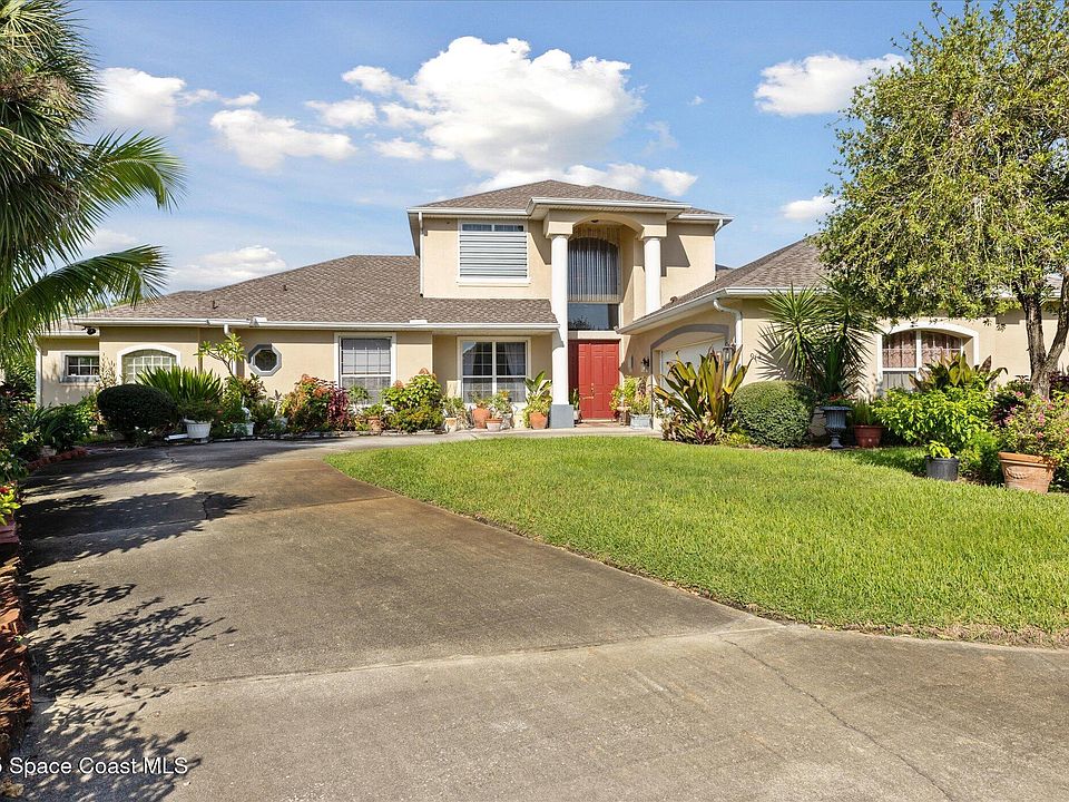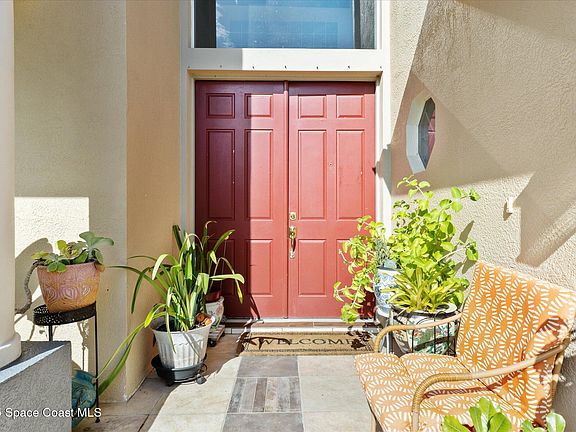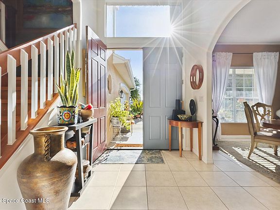 Remarkable 3BD/3BA custom-built home on an oversized lot at the end of a quiet cul-de-sac in Lockmar's prestigious Reserve! Peaceful location with no through traffic, yet close to schools and amenities. Inside, soaring 18-30 ft ceilings, a dramatic foyer with chandelier, and arched windows fill the home with light. The updated kitchen offers granite counters & stainless appliances. A versatile bonus room with private entrance makes an ideal office, in-law, or guest suite. Upstairs features a spacious suite with full bath, wet bar & balcony—perfect for coffee or evening relaxation. The master suite boasts oversized walk-in closets, double vanities, walk-in shower & jetted Jacuzzi tub framed by glass block accents. Outdoor living includes an L-shaped screened porch with hot tub space, lush garden, fruit trees & sprinkler system. Major updates: Roof, AC & Water Heater (2024). A truly one-of-a-kind home in one of Palm Bay's most sought-after neighborhoods!